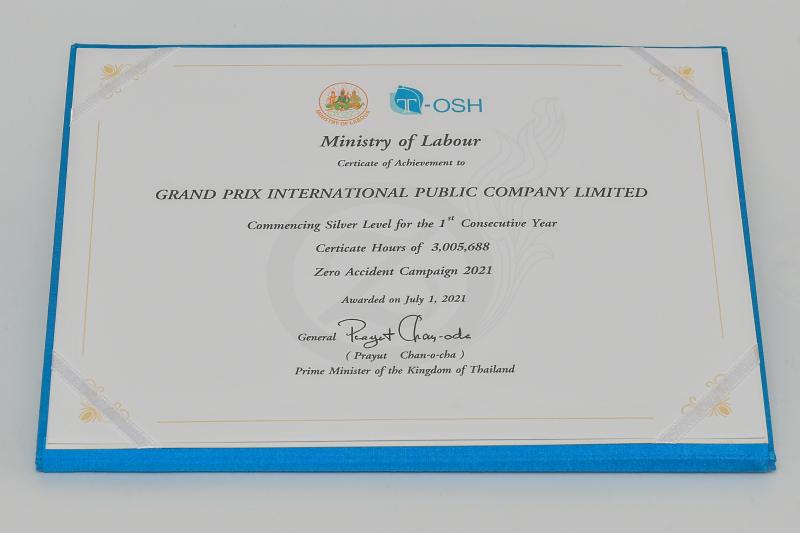 บริษัท กรังด์ปรีซ์ อินเตอร์เนชั่นแนล จำกัด (มหาชน) รับรางวัลโล่ประกาศเกียรติคุณ ระดับเงิน จากกิจกรรมการรณรงค์ลดสถิติอุบัติเหตุจากการทำงานให้เป็นศูนย์ ประจำปี 2564 (Zero Accident Campaign 2021) ต่อเนื่องเป็นปีที่ 3 (โดย 2 ปีที่ผ่านมารับรางวัลโล่ประกาศเกียรติคุณ ระดับทองแดง) จากสถาบันส่งเสริมความปลอดภัย อาชีวอนามัย และสภาพแวดล้อมในการทำงาน (องค์การมหาชน) โดยมีวัตถุประสงค์เพื่อให้นายจ้าง ลูกจ้าง ผู้ที่เกี่ยวข้องทั้งภาครัฐ และภาคเอกชน ตระหนักถึงความสำคัญในเรื่องความปลอดภัย อาชีวอนามัย และสภาพแวดล้อมในการทำงาน