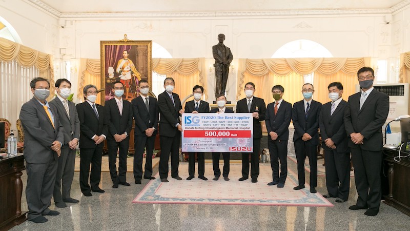 คณะบุคคลผู้ผลิตชิ้นส่วนอีซูซุ นำโดย มร.เคอิจิ ชูมะ ประธานคณะบุคคลฯ มร.มาซาชิ โอคุโบะ รองประธาน บริษัท อีซูซุมอเตอร์ (ประเทศไทย) จำกัด และผู้บริหารของผู้ผลิตชิ้นส่วนดีเด่น มอบเงินสมทบทุนสนับสนุนการพัฒนาวัคซีนโควิด-19 จำนวน 500,000 บาท ให้แก่ โรงพยาบาลจุฬาลงกรณ์ สภากาชาดไทย โดยมี ผศ.นพ. นครินทร์ ศิริทรัพย์ ผู้ช่วยคณบดี ฝ่ายวางแผนและพัฒนา คณะแพทยศาสตร์ จุฬาลงกรณ์มหาวิทยาลัย และศ.นพ.เกียรติ รักษ์รุ่งธรรม ผู้อำนวยการบริหารโครงการพัฒนาวัคซีนโควิด-19 เป็นผู้รับมอบ