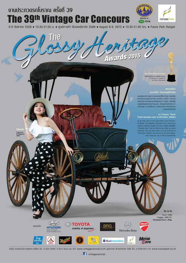 ขวัญชัย ปภัสร์พงษ์ นายกสมาคมรถโบราณแห่งประเทศไทย เปิดเผยว่า “งานประกวดรถโบราณ ครั้งที่ 39” (THE GLOSSY HERITAGE AWARDS 2015) จัดขึ้นภายใต้แนวคิด “ศตวรรษลีลา จากรถไร้ม้า ถึงยานยนต์ไร้คนขับ” โดยแสดงให้เห็นถึงจุดเริ่มต้นของรถยนต์ยุคแรกเริ่ม ที่พัฒนาจากยานพาหนะที่ใช้ม้าลากจูง มาขับเคลื่อนด้วยเครื่องยนต์ กลายเป็น “รถไร้ม้า” อันน่าทึ่ง หลังจากนั้น “รถไร้ม้า” กับลีลาชีวิตของผู้คนได้ผูกผสานกันอย่างแนบแน่นกว่าหนึ่งศตวรรษ กระทั่งใกล้ถึงยุค “ยานยนต์ไร้คนขับ” ซึ่งลีลาชีวิตของเราย่อมจะเปลี่ยนแปลงไปอย่างแน่นอน