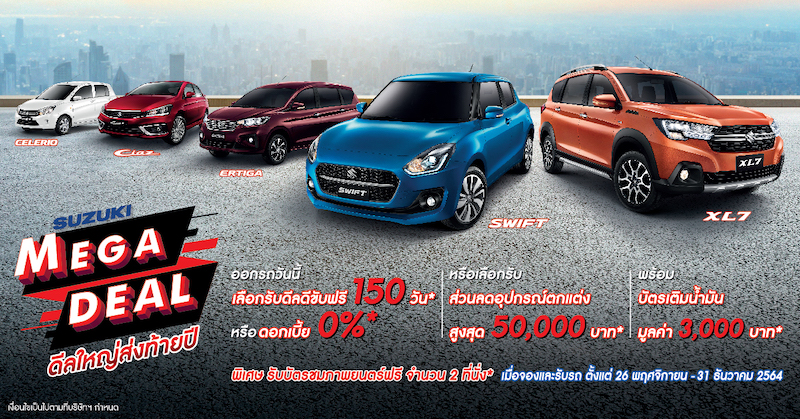 แคมเปญ “SUZUKI MEGA DEAL ดีลยิ่งใหญ่ส่งท้ายปี” มอบให้สำหรับลูกค้าที่จองรถยนต์ซูซูกิทุกท่าน