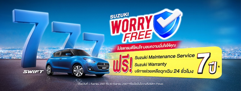 นายวัลลภ กล่าวเพิ่มเติมว่า แคมเปญพิเศษ “SUZUKI WORRY FREE ยังคงอยู่ภายใต้ปรัชญา “SUZUKI Cause We Care–เหนือกว่าความใส่ใจ คือความเข้าใจทุกความต้องการ” ด้วยการส่งมอบสินค้าที่มีแต่ความคุ้มค่า คุ้มราคา ตามปรัชญาของซูซูกิที่มุ่งมั่นในการนำเสนอผลิตภัณฑ์คุณภาพดี ในราคาที่เข้าถึงได้ง่ายเหมาะสมกับลูกค้า ควบคู่ไปกับการพัฒนางานบริการในทุกด้านเพื่อยกระดับคุณภาพของผู้จำหน่ายรถยนต์ซูซูกิทั่วประเทศเป็นเป้าหมายสำคัญยิ่งของซูซูกิ มอเตอร์ (ประเทศไทย) พร้อมเดินหน้าสร้างความเชื่อมั่นต่อลูกค้าอย่างต่อเนื่อง จัดแคมเปญพิเศษสำหรับลูกค้า SUZUKI SWIFT จองและซื้อรถ รับฟรี! บำรุงรักษารถรวมค่าแรงระยะเวลานาน 7 ปี ฟรี! รับประกันคุณภาพรถยนต์ 7 ปี ฟรี! บริการช่วยเหลือฉุกเฉิน 7 ปี พร้อมผ่อนเริ่มต้น 5,780 นานสูงสุด 99 เดือน ตั้งแต่วันนี้จนถึงวันที่ 30 กันยายน 2567