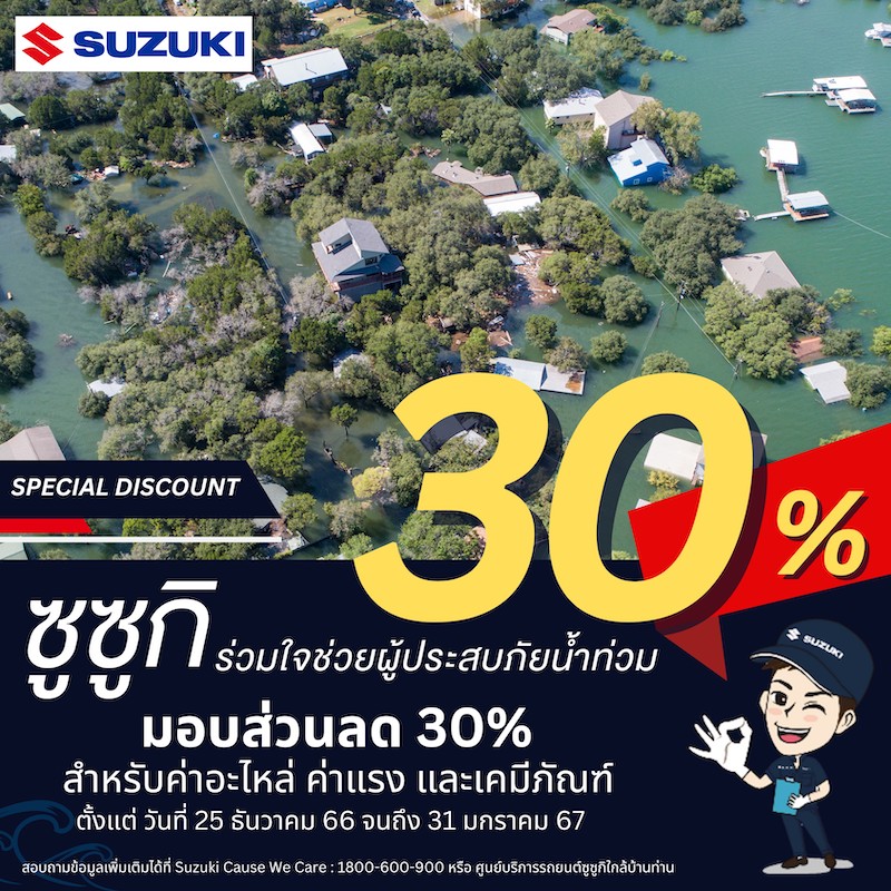 ซูซูกิ มีความตระหนักถึงความเดือดร้อนของประชาชนในพื้นที่ภาคใต้ตอนล่าง   หลังประสบภัยพิบัติทางธรรมชาติจนได้รับผลกระทบและเกิดความเสียหายอย่างหนักจากสถานการณ์น้ำท่วมฉับพลัน ซูซูกิจึงได้มีนโยบายเฉพาะกิจโดยเร่งด่วนเพื่อช่วยแบ่งเบาภาระ บรรเทาความทุกข์ และความเดือดร้อนให้กับลูกค้าผู้ใช้รถยนต์ซูซูกิ โดยได้ร่วมมือกับผู้จำหน่ายรถยนต์ซูซูกิในพื้นที่ประสบภัย จัดแคมเปญพิเศษสำหรับลูกค้ารถยนต์ซูซูกิ มอบส่วนลดพิเศษ 30% สำหรับค่าอะไหล่ (ยกเว้นแบตเตอรี่ หัวเทียน ยางรถยนต์ และอุปกรณ์ตกแต่ง) ค่าแรง และค่าเคมีภัณฑ์ ให้แก่ลูกค้ารถยนต์ซูซูกิทุกรุ่น ซึ่งอยู่ในพื้นที่ประสบอุทกภัย