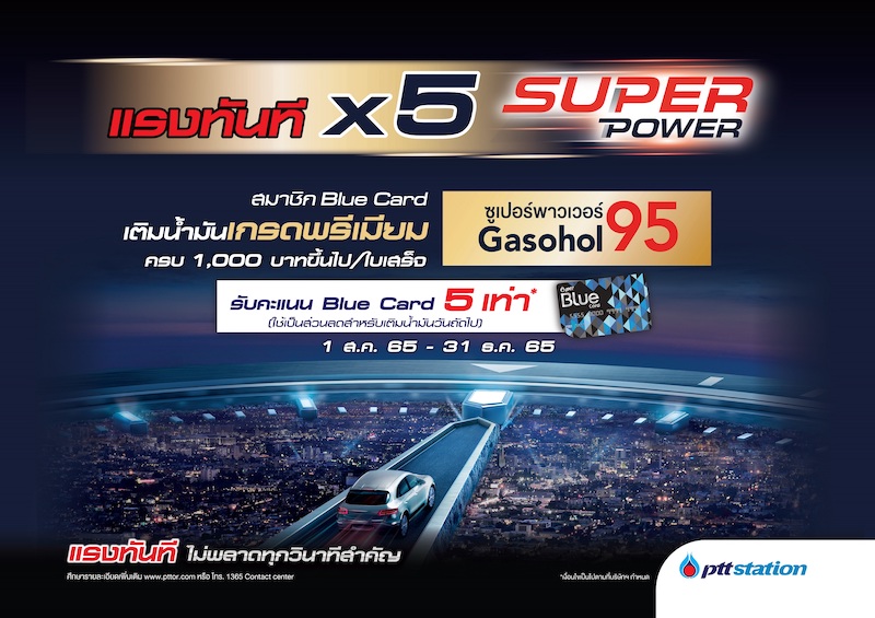 ท้าให้ลอง ซูเปอร์พาวเวอร์ แรงทันทีที่เติม พิเศษ! สำหรับสมาชิกบลูการ์ด รับคะแนนสะสม 5 เท่า! เมื่อเติมน้ำมันเกรดพรีเมียม Super Power Gasohol 95 ครบ 1,000 บาทขึ้นไป/ใบเสร็จ