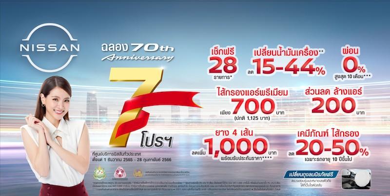 เพื่อร่วมฉลอง 70 ปีของนิสสันในประเทศไทย นิสสันได้มอบแพ็คเกจพิเศษสำหรับบริการหลังการขาย เพื่อช่วยเพิ่มความอุ่นใจและความพึงพอใจให้แก่ลูกค้า ข้อเสนอพิเศษนี้จะเริ่มตั้งแต่เดือนธันวาคม 2565 ไปจนถึงกุมภาพันธ์ 2566 เพื่อช่วยให้ลูกค้ามั่นใจและอุ่นใจตลอดการเดินทางในช่วงเทศกาล โดยลูกค้าสามารถนำรถเข้าเช็คระยะฟรี 28 รายการ ล้างรถ ดูดฝุ่น พร้อมรับส่วนลด 1,000 บาทเมื่อเปลี่ยนยาง 4 เส้นในราคาพิเศษ