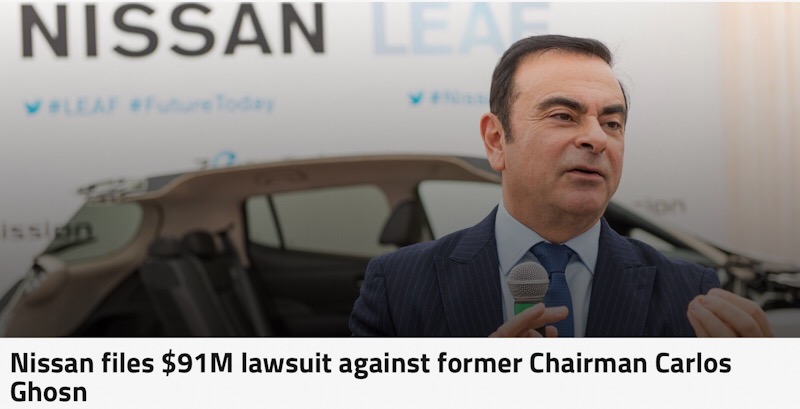 ค่ายนิสสัน มอเตอร์ ยื่นคำฟ้องร้องต่อศาล ต่ออดีตประธาน คาร์ลอส โกส์น เรียกร้องค่าเสียหาย มูลค่า 91 ล้านเหรียญ ราว 2,730 ล้านบาท จากการที่ “บริหารงานไม่ถูกต้อง และมีพฤติกรรมไม่เหมาะสม” นับแต่ขึ้นดำรงตำแหน่ง โดยสำนักข่าวรอยเตอร์ รายงานว่า ความเสียหายนั้น รวมทั้งที่อาจเกิดจากค่าปรับที่นิสสัน คาดว่าจะต้องจ่าย จากการบริหารงานที่ผิดพลาดอง โกส์น
