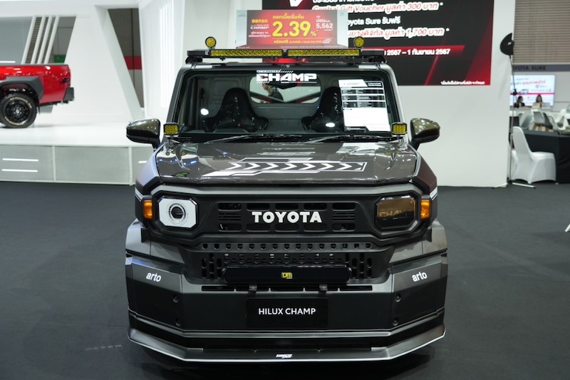 “และเรายังมีรถยนต์ยอดนิยมอีกหลายรุ่น ทั้ง Yaris ATIV, Yaris Hatchback และ Fortuner อีกทั้ง ยังมีรถยนต์อเนกประสงค์ 7 ที่นั่ง ที่สุดของเพื่อนคู่ใจสายครอบครัวระดับพรีเมียม INNOVA ZENIX และ Veloz มาให้ชมภายในงานนี้ด้วย ในส่วนของรถกระบะ นำทัพโดย Hilux Revo รุ่นปรับปรุงใหม่ ปี 2024 เริ่มจาก Hilux Revo GR-Sport 4x4 กระบะรุ่นเรือธงสมรรถนะเหนือชั้น ที่ผ่านบทพิสูจน์บนเส้นทางสุดทรหดในประเทศออสเตรเลีย และสามารถคว้าชัยชนะจากการแข่งขันสุดโหดในรายการ Asia Cross Country ที่เพิ่งจบไปเมื่อวันที่ 17 สิงหาคมที่ผ่านมา รุ่นต่อมาคือ Hilux Revo-D Prerunner และ Hilux Revo Smart Cab Prerunner ที่โดดเด่นด้วยช่วงล่างซับแรงกระแทกดีเยี่ยม มอบความสบายให้ทุกการเดินทาง และยังมี Hilux Revo Z-edition แต่งสนุก ถูกใจสายแต่งรถแน่นอนครับ สำหรับผู้ประกอบการต่างๆ เราขอนำเสนอ Hilux Champ กับแพ็กเกจต่อเติมรถ สร้างธุรกิจเคลื่อนที่ในฝันได้ ครบ จบ ในที่เดียว”