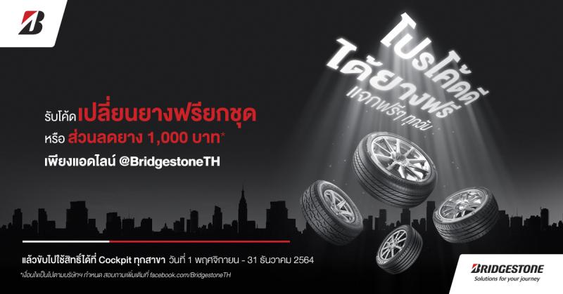 บริดจสโตน และค็อกพิท จัดโปรโมชั่นสุดพิเศษส่งท้ายปี ในแคมเปญ “โปรโค้ดดี ได้ยางฟรี” ทุกวัน จัดเต็มแทนคำขอบคุณเพื่อลูกค้าบริดจสโตน และค็อกพิทโดยเฉพาะ เพียงลงทะเบียนผ่านเว็ปไซต์ https://bridgestonespecialcampaign.cockpit.co.th หรือแอดไลน์ @BridgestoneTH หรือ @Cockpit โดยสามารถเก็บโค้ดตั้งแต่วันที่ 1 พฤศจิกายน – 25 ธันวาคม 2564 รับยางฟรียางบริดจสโตนยกชุด หรือรับส่วนลดยาง 1,000 บาท* แจกหนักแจกจริงทุกวัน