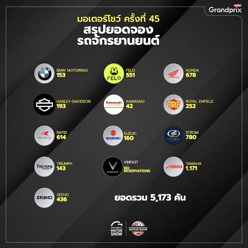 ขณะที่รถจักรยานยนต์ในปีนี้มีแบรนด์จากประเทศจีนเข้าร่วมงานถึง 5 แบรนด์ ซึ่งเป็นรถจักรยานยนต์ไฟฟ้าที่ได้รับความสนใจจากผู้เข้าชมงานไม่น้อยเช่นกัน ทำให้มียอดจองรถจักรยานยนต์ภายในงานรวมทั้งสิ้น 5,173 คัน