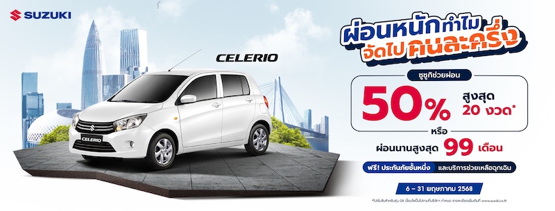 ซูซูกิเล็งเห็นถึงความต้องการของผู้บริโภคที่กำลังมองหารถยนต์คุณภาพดีที่สามารถเป็นเจ้าของได้ง่าย คุ้มค่า ประหยัดพลังงาน และประหยัดค่าใช้จ่ายในการดูแลรักษา ภายใต้แนวคิด “SUZUKI Cause We Care – เหนือกว่าความใส่ใจ คือความเข้าใจทุกความต้องการ” ท่ามกลางภาวะเศรษฐกิจที่ยังเปราะบาง แต่การมีรถยนต์ยังคงเป็นสิ่งจำเป็น ทั้งในฐานะพาหนะเพื่อยกระดับคุณภาพชีวิต และเป็นเครื่องมือในการประกอบอาชีพ ซูซูกิจึงเตรียมสร้างปรากฏการณ์ครั้งใหม่ ด้วยการเปิดตัวแคมเปญสุดร้อนแรงแห่งปี “ผ่อนหนักทำไม จัดไปคนละครึ่ง” ซื้อ SUZUKI CELERIO ซูซูกิช่วยผ่อน 50% หรือเลือกผ่อนนานสูงสุด 99 เดือน เพื่อเปิดโอกาสให้ผู้บริโภคสามารถเป็นเจ้าของรถได้ง่ายขึ้น และใช้งานได้อย่างคุ้มค่าในทุกมิติของการใช้ชีวิต