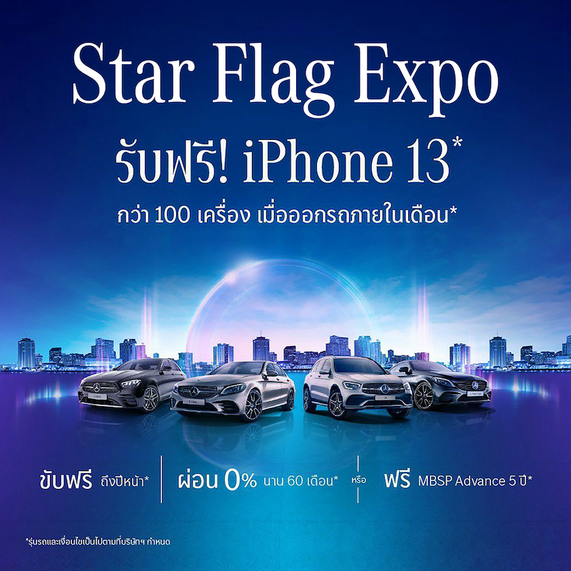 เพื่อกระตุ้นยอดในช่วงสุดท้ายของปี ซึ่งมีการจัดงาน Motor Expo ตามคอนเซปต์ “Best Deal Guarantee ออกรถให้ได้ดีลดีที่สุดต้องที่ เบนซ์ สตาร์แฟลก” บริษัทฯ ได้เตรียมดีลพิเศษส่งท้ายปีให้ลูกค้าได้เลือกสุดคุ้มรับปีใหม่ กับงาน Star Flag Expo ที่เริ่มตั้งแต่ต้นเดือนพฤศจิกยน จนถึง วันที่ 12 ธันวาคม มอบส่วนลดพิเศษทุกคันทุกรุ่น พร้อมอัดโปรโมชั่น ออกรถวันนี้ขับฟรีถึงปีหน้า นอกจากนี้ยังร่วมมือกับไฟแนนซ์ เพื่อแบ่งเบาภาระให้ลูกค้าที่ซื้อรถกับ เบนซ์ สตาร์แฟลก ทุกรุ่น ภายในปีนี้สามารถเลือกแคมเปญผ่อน 0% นาน 60 เดือน หรือเลือกเซอร์วิสแพ็คเกจที่ให้ความอุ่นใจตลอดการใช้งานถึง 5 ปี พร้อมจัด iphone 13 ให้เพิ่มเป็นของขวัญปีใหม่ด้วย ซึ่งลูกค้าสามารถเลือกชมและช้อปแคมเปญพิเศษนี้ได้ในงาน Motor Expo และที่โชว์รูม เบนซ์ สตาร์แฟลก ซึ่งจะมีการขยายเวลาเปิดบริการถึง 22.00 น.และยังคงจัด Private Showroom ให้บริการลูกค้าที่ต้องการชมรถแบบส่วนตัว
