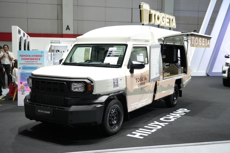 “HILUX CHAMP” ให้ทุกโอกาสเป็นไปได้ กับ ไฮลักซ์ แชมป์ ใหม่ กระบะท้ายเรียบพร้อมดัดแปลง แบบเปิดได้ 3 ทาง เพิ่มความสามารถในการบรรทุก สะดวกและทนทาน พร้อมโครงสร้างที่เอื้อต่อการดัดแปลง ช่วยลดต้นทุนและเวลา ลดค่าใช้จ่ายให้กับผู้ประกอบการ ตอบโจทย์การใช้งานทั้งเชิงพาณิชย์และการใช้งานส่วนตัว ให้คุณเป็นอะไรก็ได้ ทำอะไรก็ได้ ไปไหนก็ได้กับ ไฮลักซ์ แชมป์ ภายในงานได้มีการนำรถไฮลักซ์ แชมป์ มาดัดแปลงเป็นร้านกาแฟเคลื่อนที่ของแบรนด์ TOGETA ซึ่งเป็นแบรนด์คาเฟ่จากโตโยต้า เปิด-ปิดง่าย และปลอดภัยด้วยเซฟตี้โช้คอัพ Build-in ฟังชั่นเป็นสัดส่วนครบครัน ทั้งพื้นที่ใช้งานและพื้นที่เก็บของ รองรับการใช้งานร้านกาแฟได้จริง พร้อมติดตั้งถังน้ำแข็ง ตู้แช่นม ออกแบบเพิ่มฟังก์ชันการวางอุปกรณ์ เครื่องชง ไซรัป และตู้เย็นเล็กฝั่งคนชงให้สามารถทำงานได้อย่างคล่องตัว ติดตั้งระบบน้ำและระบบไฟ พร้อมใช้งาน
