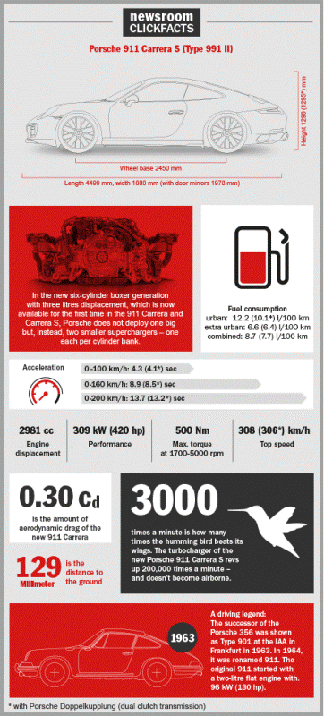 หากพูดถึงรถสปอร์ตสุดหรูอย่าง พอร์ช แล้ว ไม่มีใครไม่รู้จักรุ่นยอดนิยมสร้างชื่ออย่าง 911 คาร์เรร่า ซึ่งทำยอดขายจนเป็นรถสปอร์ตที่ขายดีที่สุดในโลกในรอบ 10 ปีเลยทีเดียว ซึ่งตอนนี้เจนเนอเรชั่นใหม่ของ 911 คาร์เรร่า ก็กำลังจะออกมายั่วน้ำลายแฟนๆของ พอร์ช กันแล้ว ซึ่งก็ยังคงคอนเซ็ปต์เดิมเอาไว้คือ ขับสนุกแต่ต้องหรูและสบาย ต้องขอบคุณประสบการณ์ในการสร้างเครื่องยนต์เทอร์โบมามากว่า 40 ปี สำหรับรถแข่งในสนามและสำหรับรถสปอร์ตที่ผลิตขายทั่วโลก โดยเจ้าเทอร์โบคู่ตัวใหม่ของ 911 คาร์เรร่า นี้สามารถเพิ่มม้าให้กับเครื่องยนต์ได้อีก 20 ตัวในขณะที่อัตราการสิ้นเปลืองเชื้อเพลิงกลับไปในทางตรงกันข้าม ขุมพลังใหม่นี้สามารถรีดแรงม้าได้ถึง 370 แรงม้า (272kW) และในรุ่น 911 คาร์เรร่า เอส สามารถทำได้ถึง 420 แรงม้า (309 kW) ซึ่งมีการปรับแต่งเครื่องยนต์และระบบท่อไอเสียเพิ่มเติมในรุ่น เอส ในส่วนอัตราสิ้นเปลืองเชื้อเพลิงทำได้ดีถึง 7.4 และ7.7 ลิตรต่อ 100 กิโลเมตร ตามลำดับ