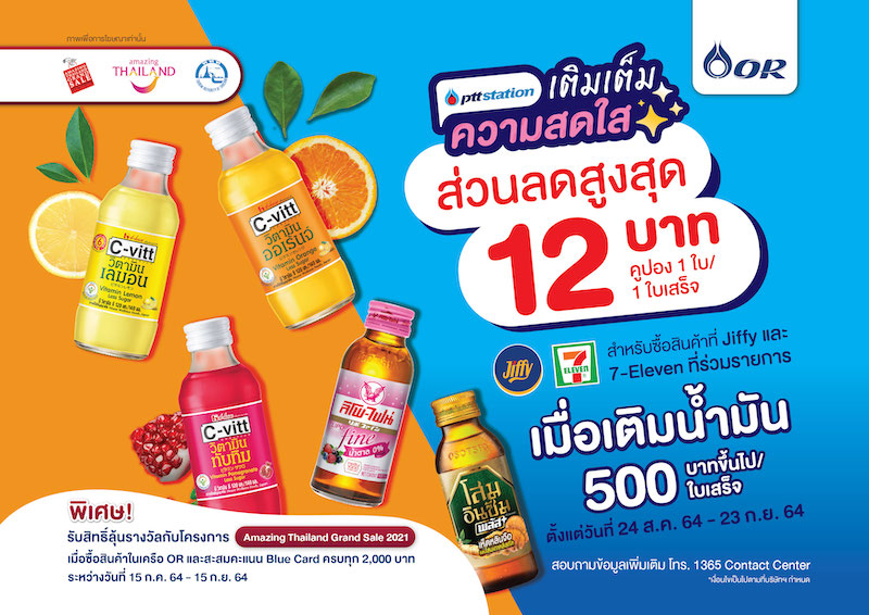นอกจากได้เติมเต็มความสดใสแล้ว ยังสามารถร่วมรับสิทธิ์ลุ้นรางวัลจาก โครงการ Amazing Thailand Grand Sale 2021 เมื่อมียอดใช้จ่ายสินค้าในเครือโออาร์ครบทุก 2,000 บาท พร้อมสะสมคะแนน Blue Card ในช่วงเวลาตั้งแต่วันที่ 15 กรกฎาคม 2564 – 15 กันยายน 2564