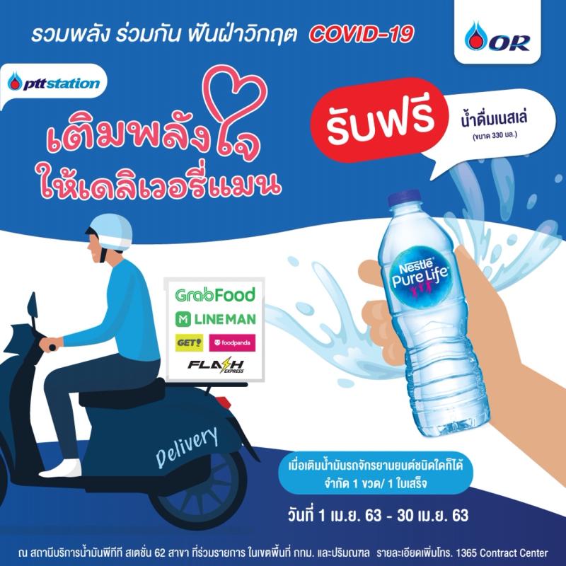 พีทีที สเตชั่น รวมพลังร่วมกันฟันฝ่าวิกฤต COVID-19 โดยขอเป็นส่วนหนึ่งในการส่งมอบกำลังใจเล็ก ๆ ไปยังทุกคน ด้วยการร่วมเติมพลังใจ พร้อมเพิ่มความสดชื่นให้กับพี่ ๆ เดลิเวอรี่แมนแทนคำขอบคุณที่ช่วยปฏิบัติภารกิจส่งมอบอาหาร และเครื่องดื่มถึงมือผู้บริโภค รวมถึงรถจักรยานยนต์ทุกคันที่เข้ามาเติมน้ำมันชนิดใดก็ได้ใน “พีทีที สเตชั่น” (ไม่จำกัดจำนวนการเติมขั้นต่ำ) รับฟรี! น้ำดื่มเนสเล่ ขนาด 330มล. 1 ขวดต่อ 1 ใบเสร็จ ณ พีทีที สเตชั่น 62 สาขาที่ร่วมรายการ ในเขตกรุงเทพฯ และปริมณฑล ตั้งแต่วันที่ 1 เม.ย. 63 – 30 เม.ย 63