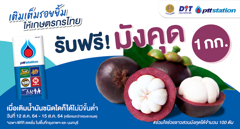 บริษัท ปตท. น้ำมันและการค้าปลีก จำกัด (มหาชน) (โออาร์) ร่วมกับกรมการค้าภายใน กระทรวงพาณิชย์ จัดโครงการ พีทีที สเตชั่น เติมเต็มรอยยิ้มให้เกษตรกรไทยเพื่อบรรเทาความเดือดร้อนของเกษตรกรชาวสวนมังคุด โดยรับซื้อมังคุดจำนวน 100,000 กิโลกรัมจากเกษตรกรชาวสวนมังคุด จ.นครศรีธรรมราช ซึ่งประสบปัญหาจากการแพร่ระบาดของโรคโควิด-19 ทำให้ไม่มีช่องทางระบายสินค้า เป็นผลให้มีผลผลิตล้นตลาดและราคาตกต่ำ และส่งต่อรอยยิ้มโดยนำมังคุดมามอบให้ผู้ใช้บริการ พีทีที สเตชั่น ที่เติมน้ำมันชนิดใดก็ได้ไม่มีขึ้นต่ำ ระหว่างวันที่ 12 -15 สิงหาคม 2564 ณ สถานีบริการน้ำมัน พีทีที สเตชั่น 218 แห่ง ในพื้นที่กรุงเทพมหานครและนนทบุรี รับฟรี มังคุด 1 กก. พร้อมกันนี้ โออาร์ ยังได้ส่งมอบมังคุดจำนวน 10,000 กิโลกรัม ให้กับ หน่วยงาน โรงพยาบาล องค์กรเอกชน กลุ่มจิตอาสาต่าง ๆ และศูนย์พักคอยของกรุงเทพมหานคร รวมทั้งสิ้น 79 แห่ง เพื่อสนับสนุนการดำเนินการและเป็นขวัญและกำลังใจในการปฏิบัติหน้าที่ของเจ้าหน้าที่และอาสาสมัครอีกด้วย ผู้สนใจสอบถามรายละเอียดเพิ่มเติมได้ที่ โทร. 1365 Contact Center