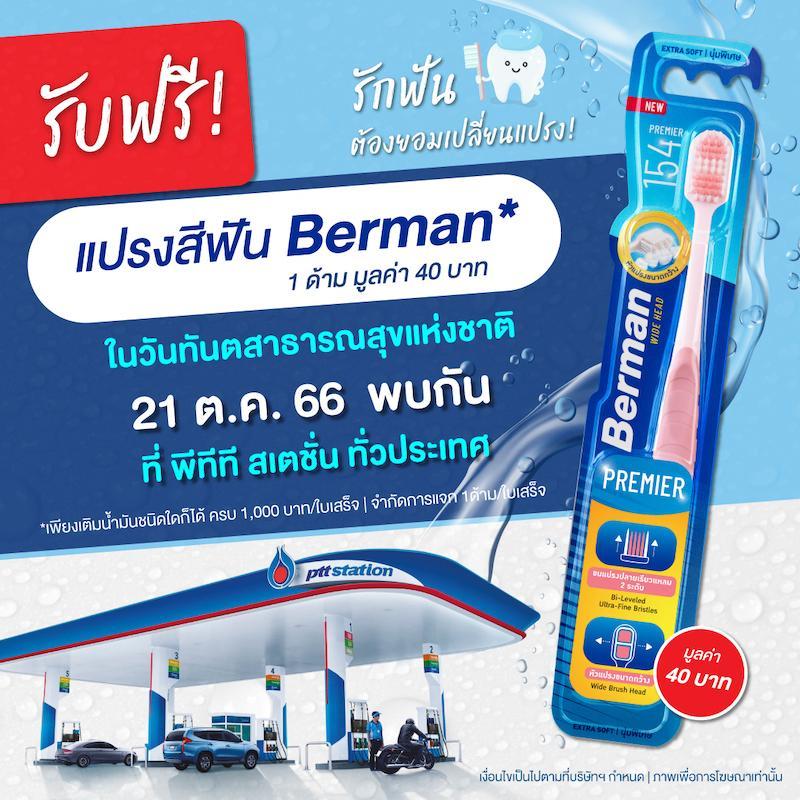 พีทีที สเตชั่น เติมเต็มสุขภาพฟันดี ในวันทันตสาธารณสุขแห่งชาติเติมน้ำมันทุกชนิด ครบ 1,000 บาทขึ้นไป รับฟรีแปรงสีฟันเบอร์แมน พรีเมียร์ 154 มูลค่า 40 บาท