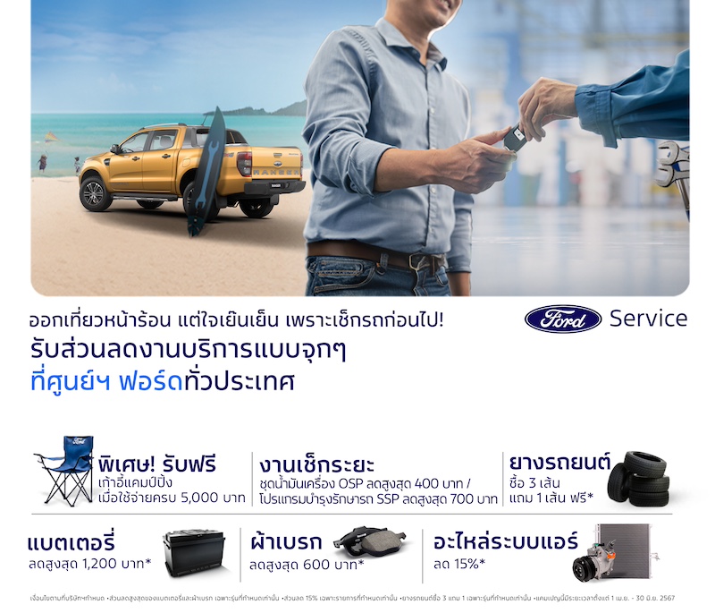 ฟอร์ด ประเทศไทย จัดแคมเปญ อากาศมันร้อน แต่รถฟอร์ดเย็นของแทร่ข้อเสนอด้านบริการสุดคุ้มให้ลูกค้าใช้รถได้อย่างอุ่นใจตลอดการเดินทางท่องเที่ยวในช่วงฤดูร้อน ประกอบด้วย ส่วนลดค่าอะไหล่ระบบปรับอากาศถึง 15% ส่วนลดพิเศษชุดน้ำมันเครื่องสูงสุด 400 บาท หรือส่วนลดโปรแกรมบำรุงรักษาตามระยะสูงสุด 700 บาท ซื้อยางรถยนต์ 3 เส้น แถมฟรี 1 เส้น ส่วนลดเมื่อเข้ารับบริการเปลี่ยนแบตเตอรี่หรือผ้าเบรก และบริการตรวจเช็คสภาพรถ 30 รายการฟรี พิเศษยิ่งขึ้น รับเก้าอี้สนาม เมื่อมีค่าใช้จ่าย 5,000 บาทขึ้นไป เพียงนำรถเข้ารับบริการที่ศูนย์บริการฟอร์ดทั่วประเทศ ตั้งแต่วันนี้ ถึง 30 มิถุนายน 2567