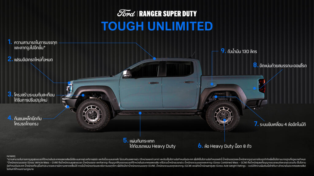 2 ความสามารถในการลากจูงสูงสุดของรถที่จำหน่ายในประเทศออสเตรเลียเมื่อใช้ระบบลากพ่วงแท้จากฟอร์ด และติดตั้งระบบเบรกแล้ว ไม่รวมหัวบอลลากพ่วง (จำหน่ายแยกต่างหาก) และต้องเป็นไปตามข้อกำหนดในประเทศ เพื่อให้เป็นไปตามข้อกำหนดเหล่านี้ น้ำหนักบรรทุกและน้ำหนักลากจูงรวม อาจต้องถูกจำกัดเพื่อเป็นไปตามมาตรฐานที่กฎหมายกำหนด น้ำหนักรถรวมบรรทุก (Gross Vehicle Mass – GVM) คือน้ำหนักรวมสูงสุดของรถ น้ำหนักบรรทุก และหัวลากจูง ที่อนุญาตให้บรรทุกของรถที่จำหน่ายในประเทศออสเตรเลีย แต่ไม่รวมน้ำหนักของรถพ่วง น้ำหนักรถรวมบรรทุกและลากจูง (Gross Combined Mass – GCM) คือน้ำหนักสูงสุดที่อนุญาตของรถยนต์และรถพ่วงรวมกัน เป็นไปตามข้อกำหนดในประเทศ น้ำหนักรถที่ระบุเป็นค่าประมาณและอาจมีความคลาดเคลื่อนได้ ควรชั่งน้ำหนักรถก่อนและหลังการบรรทุกใดๆ เพื่อให้แน่ใจว่าน้ำหนักรถรวมบรรทุก (GVM), น้ำหนักรถรวมบรรทุกและลากจูง (GCM) และพิกัดน้ำหนักเพลาสูงสุด (Gross Axle Weight Ratings – จะแจ้งให้ทราบเพิ่มเติมเมื่อใกล้วันวางจำหน่ายในประเทศไทย ไม่เกินค่าที่กำหนดตามกฎหมาย