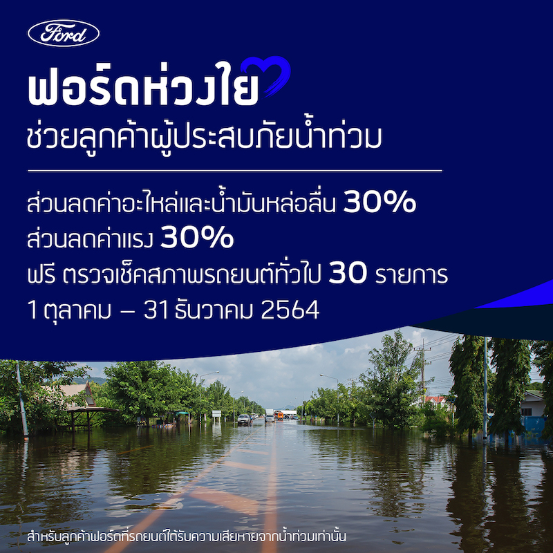 ฟอร์ด ประเทศไทย ส่งแคมเปญบรรเทาความเดือดร้อนของลูกค้าฟอร์ดที่ประสบภัยน้ำท่วมด้วยการมอบส่วนลดอะไหล่ น้ำมันเครื่องและค่าแรง 30% พร้อมตรวจเช็คสภาพรถยนต์ทั่วไปฟรี 30 รายการให้กับลูกค้าฟอร์ดที่ประสบภัยน้ำท่วม ตั้งแต่วันนี้ จนถึงวันที่ 31 ธันวาคม 2564ที่ศูนย์บริการฟอร์ด ทั่วประเทศ