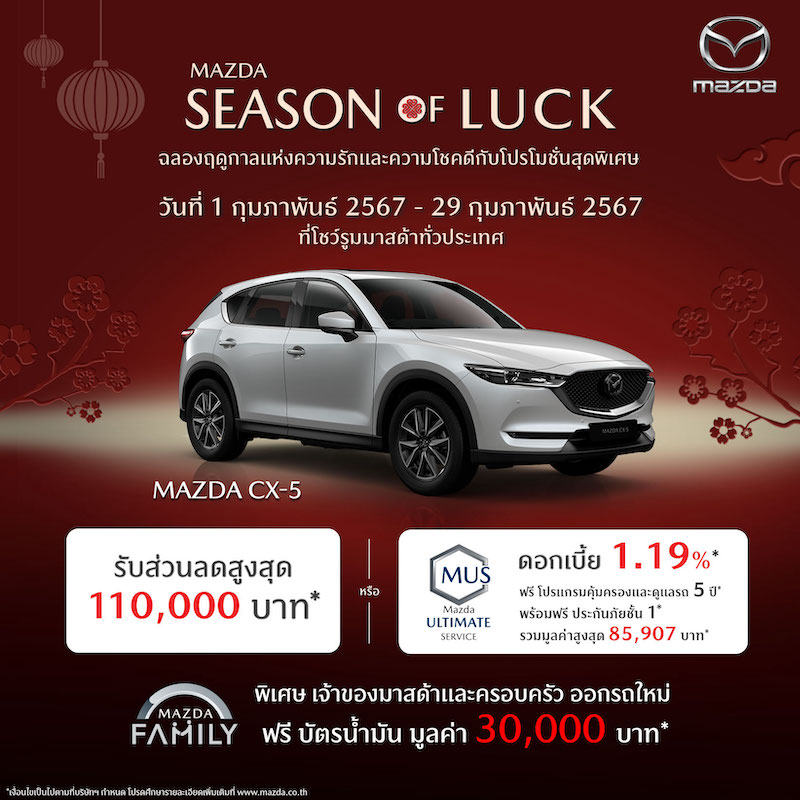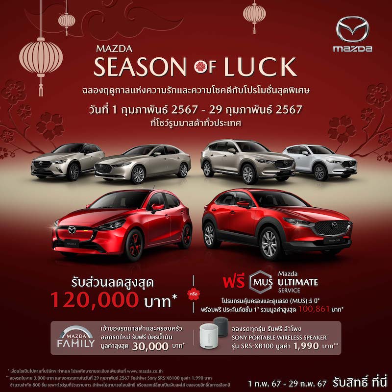 1 กุมภาพันธ์ 2567 – มาสด้าเดินหน้ากระตุ้นตลาดแบบเต็มสูบ โอกาสทองของลูกค้ามาถึงแล้ว ครั้งแรกและครั้งเดียวในรอบปี กับรถยนต์มาสด้าทุกรุ่นในราคาสุดพิเศษ สำหรับลูกค้าที่ต้องการเป็นเจ้าของรถยนต์นั่งสปอร์ตระดับพรีเมี่ยมที่สง่างามที่สุดในโลก เจ้าของรางวัลรถยนต์ออกแบบยอดเยี่ยมของโลก World Car Design of The Year อัดแน่นไปด้วยเทคโนโลยีสกายแอคทีฟ และระบบความปลอดภัยระดับโลก เมื่อมาสด้าร่วมฉลองฤดูกาลแห่งความรักและความโชคดีกับโปรโมชั่นพิเศษสุดครั้งเดียวในรอบปี SEASON OF LUCK มอบสิทธิพิเศษสำหรับลูกค้าที่ต้องการซื้อรถยนต์มาสด้าตลอดเดือนกุมภาพันธ์ รับส่วนลดสูงสุด 120,000 บาท* หรือ โปรแกรมคุ้มครองและดูแลรถ 5 ปี (MUS) พร้อมฟรีประกันภัยชั้น 1 รวมมูลค่าสูงสุด 100,861 บาท* และเมื่อจองซื้อรถยนต์มาสด้าทุกรุ่น รับฟรีลำโพง Sony Portable Wireless Speaker มูลค่า 1,990 บาท** พร้อมมอบสิทธิพิเศษให้กับเจ้าของรถยนต์มาสด้าและครอบครัวที่ออกรถใหม่ รับเพิ่มฟรีบัตรน้ำมันมูลค่าสูงสุด 30,000 บาท*** ลูกค้าที่สนใจพบข้อเสนอพิเศษนี้ได้ระหว่างวันที่ 1-29 กุมภาพันธ์ 2567 ที่โชว์รูมมาสด้าทั่วประเทศ