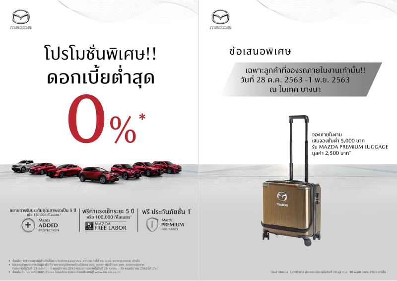 ยกขบวนรถยนต์มาสด้าภายใต้เทคโนโลยีสกายแอคทีฟและการออกแบบอันสง่างามของ โคโดะ ดีไซน์ หลากหลายรุ่นทั้งรถยนต์นั่งที่กำลังฮ็อตฮิตอย่าง Mazda2, Mazda3 และ CX-30 ที่นำมาปรับลุคให้สวยงามมากยิ่งขึ้นด้วยชุดแต่งพิเศษแท้จากโรงงาน Signature Style และรถอเนกประสงค์ครอสโอเวอร์เอสยูวีตระกูล CX-Series ที่กำลังได้รับความนิยมอย่างสูงจากลูกค้า อาทิ CX-30, CX-5 และ CX-8 มาให้ลูกค้าสัมผัสกับความหรูหรา พรีเมียมแบบจัดเต็ม พร้อมมอบข้อเสนอสุดคุ้มกับอัตราดอกเบี้ยต่ำสุด 0% ฟรีประกันภัยชั้น 1 Mazda Premium Insurance 1 ปี ทุกรุ่น อุ่นใจตลอดการเดินทางด้วยโปรแกรมขยายการรับประกันคุณภาพรถยนต์นานสูงสุดถึง 5 ปี หรือ 150,000 กิโลเมตร เตรียมรับกระเป๋าเดินทาง MAZDA PREMIUM LUGGAGE มูลค่า 2,500 บาท เมื่อจองซื้อรถยนต์ทุกรุ่นภายในงานฯ ตั้งแต่ 5,000 บาทขึ้นไป และออกรถภายในวันที่ 30 พฤศจิกายนนี้ สำหรับงาน FAST Auto Show Thailand 2020 จัดขึ้นตั้งแต่วันพุธที่ 28 ตุลาคม – วันอาทิตย์ที่ 1 พฤศจิกายน 2563 ณ ไบเทค บางนา ให้คุณเจ้าของรถมาสด้าได้ง่ายๆ ด้วยเงื่อนไขสุดพิเศษดังนี้