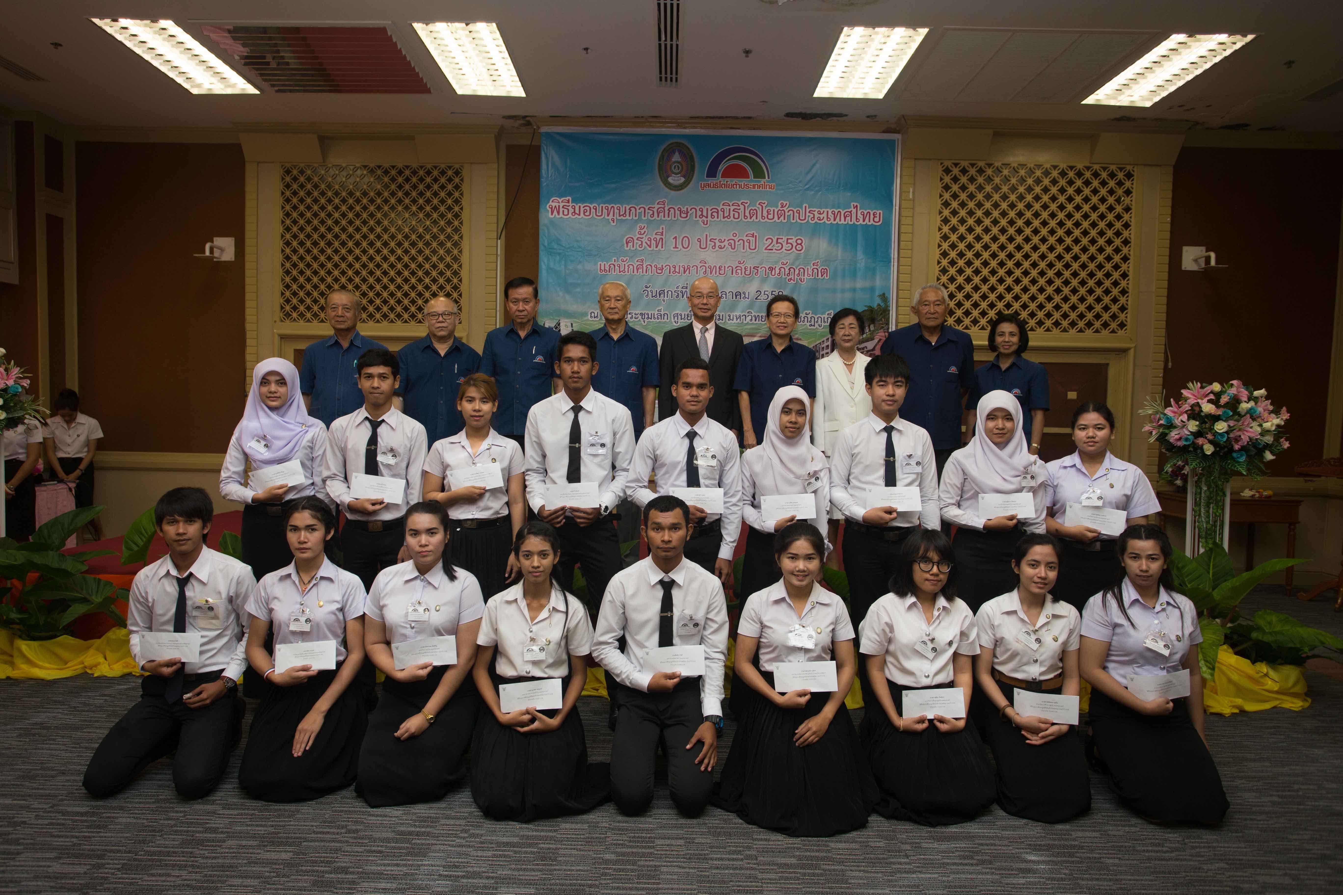 การมอบทุนการศึกษา ประจำปี 2558 มีนักศึกษาจากมหาวิทยาลัยราชภัฏภูเก็ต เข้ารับทุนจำนวน 130 ทุน รวมมูลค่าทั้งสิ้น 1,000,000 บาท โดยมีรายละเอียดดังนี้คือ
