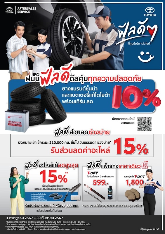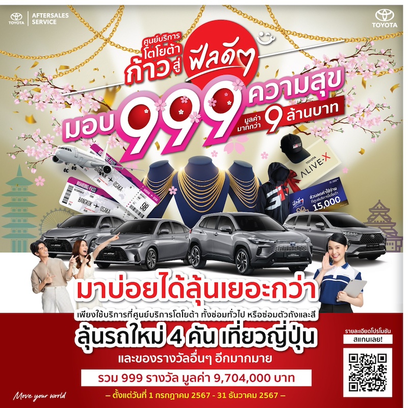 บริษัท โตโยต้า มอเตอร์ ประเทศไทย จำกัด ร่วมกับผู้แทนจำหน่ายโตโยต้าทั่วประเทศ จัดแคมเปญสุดพิเศษ “ศูนย์บริการโตโยต้า ก้าวสู่ฟีลดีๆ มอบ 999 ความสุข ลุ้นของรางวัลกว่า 9 ล้านบาท” เชิญชวนลูกค้าโตโยต้าทุกท่านเข้ารับบริการที่ศูนย์บริการซ่อมทั่วไปหรือศูนย์บริการซ่อมตัวถังและสี ตั้งแต่ 1 กรกฎาคม 2567 – 31 ธันวาคม 2567 ลุ้นโชคชิงรางวัลใหญ่ ทั้งรถยนต์โตโยต้าจำนวนมากถึง 4 คัน , แพ็กเกจท่องเที่ยวประเทศญี่ปุ่น จำนวน 15 รางวัล, สร้อยคอทองคำ และรางวัลอื่นๆอีกมากมาย