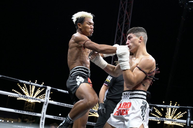 และ ในพิกัด 70 กิโลกรัม ระหว่าง ป.ต.ท. ว.รุจิรวงศ์ พบกับ อเลสซิโอ มาลาเตสต้า นักชกอิตาลี คู่สุดท้ายของงานก็ดุเดือดไม่แพ้คู่อื่น เริ่มต้นยกแรกออกอาวุธครบเครื่องทั้งหมัด เท้า เข่า ศอก มุ่งมั่นเดินเกมรุกกันอย่างหนัก จบยกที่หนึ่งก็ได้เห็นเลือดกำเดาจากทางอเลสซิโอ ยกที่สองเพิ่มความเดือดมากขึ้น ทั้งคู่เดินหน้าออกอาวุธกันแบบสุดตัว ไม่มีใครยอมใคร ถือว่าสูสีกันมากในยกนี้ ยกสุดท้ายทำเอากองเชียร์ลุ้นกันตัวโก่ง ในยกนี้ ป.ต.ท. ปล่อยหมัดได้แม่นกว่า ทำให้สุดท้าย ป.ต.ท. คว้าแชมป์ไปครอง แชมป์ THAI FIGHT 2023 ทั้ง 3 รุ่นนี้ได้รับถ้วยพระราชทานพระบาทสมเด็จพระเจ้าอยู่หัว พร้อมกับปิกอัพ “ใหม่! อีซูซุ ดีแมคซ์ ไฮแลนเดอร์ 1.9 ดีดีไอ รุ่น 2 ประตู ไปครอง