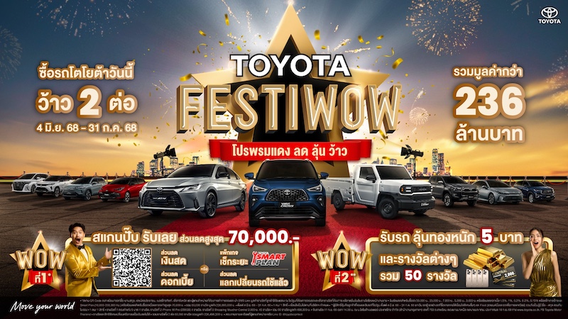 โตโยต้าเสิร์ฟโปรโมชันเด็ดช่วงกลางปี “โตโยต้า เฟสติว้าว (FESTIWOW) โปรพรมแดง ลด ลุ้น ว้าวว” กับข้อเสนอพิเศษที่จะทำให้ว้าว 2 ต่อ กับ ว้าวที่ 1 กับหลายทางเลือก เพื่อให้เลือกรับหนึ่งสิทธิ์สุดว้าว ตามใจลูกค้า ทั้งส่วนลดเงินสด หรือเลือกรับส่วนลดดอกเบี้ย เมื่อซื้อรถใหม่ หรือจะเลือกแพ็กเกจเช็กระยะ ที่สร้างความมั่นใจให้ลูกค้าขั้นสุด รวมทั้งยังมีส่วนลดแลกเปลี่ยนรถใช้แล้ว สำหรับซื้อรถยนต์คันใหม่เมื่อนำรถยนต์คันเก่ามาขาย ว้าวที่ 2 เมื่อรับรถแล้ว ยังได้ลุ้นต่อกับ ลุ้นทองคำหนัก 5 บาท และรางวัลอื่นๆ อีกมากมาย โปรโมชันดีๆแบบนี้ เสิร์ฟพิเศษสำหรับลูกค้าที่จองและออกรถยนต์โตโยต้าทุกรุ่นตั้งแต่วันที่ 4 มิถุนายน – 31 กรกฎาคม 2568 ณ โชว์รูมโตโยต้าทั่วประเทศ