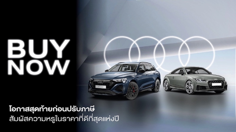 - ราคาดีที่สุดแห่งปี โดยลูกค้าที่จองและซื้อ Audi ทุกรุ่น จะได้สิทธิ์ราคาพิเศษ ก่อนภาษีสรรพสามิตใหม่ซึ่งจะเริ่มต้นในวันที่ 1 มกราคม 2569 ส่งผลทำให้ต้องมีการปรับราคาบางรุ่นสูงขึ้นหลายแสนถึงล้านบาท