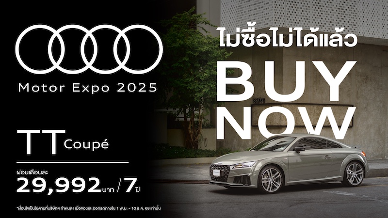 อาวดี้ ประเทศไทย เชื่อมั่นว่าแคมเปญ Audi Motor Expo 2025 ซึ่งเริ่มแล้วตั้งแต่วันนี้ จนถึงช่วงงานมหกรรมยานยนต์ Motor Expo 2025 จะได้รับความสนใจจากลูกค้าอย่างล้นหลาม โดยเฉพาะยนตรกรรมสปอร์ตพรีเมียม Audi TT Coupé ไอคอนยอดนิยมตลอดกาล ทั้งนี้สำหรับความพิเศษของแคมเปญ #AudiMotorExpo ที่พลาดแล้วอาจพลาดเลย คือ