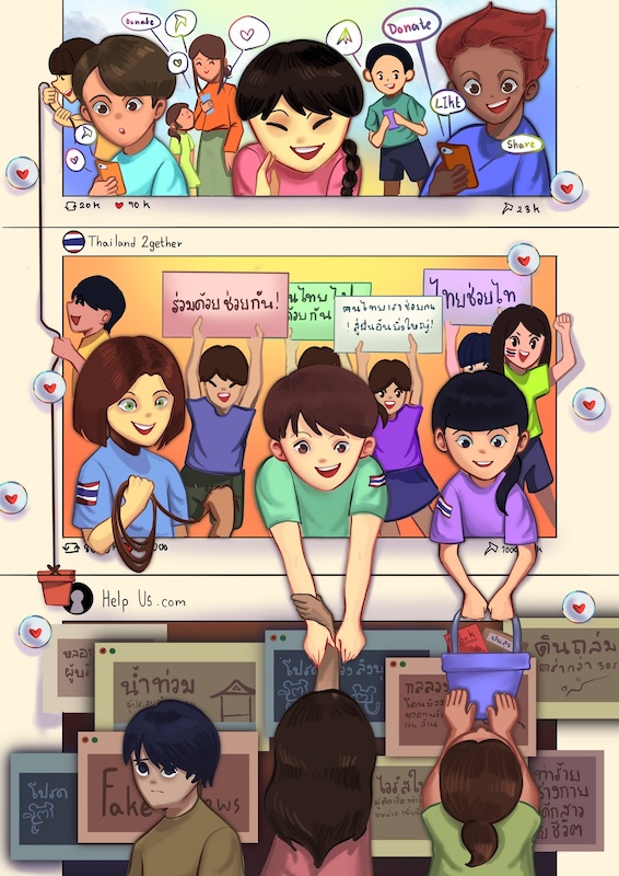 “หัวข้อสดในรอบชิงชนะเลิศปีนี้ “ไทยช่วยไทย ก้าวไปด้วยกัน” ทำให้หนูรู้สึกตกใจเล็กน้อยเพราะไม่ได้เตรียมตัวสำหรับหัวข้อนี้มา แต่ก็เข้ากับยุคสมัยตอนนี้ดีค่ะ ภาพวาดของหนูต้องการสะท้อนว่า เราเป็นคนไทยและอยู่ในเมืองไทยด้วยกันก็ควรให้ความช่วยเหลือกัน ถ้าอยู่ใกล้ก็เอื้อมมือไปช่วย ถ้าไกลก็ส่งกำลังใจ แต่ไม่ว่าจะอยู่ที่ไหน เราก็ช่วยกันได้เสมอค่ะ อยากเชิญชวนเพื่อน ๆ ให้เข้าร่วมกิจกรรมนี้ในครั้งต่อ ๆ ไป เพราะเป็นโอกาสที่ดีมากที่จะได้โชว์ฝีมือการวาดภาพของเรา” เด็กหญิงกันตา ณ ลำพูน โรงเรียนเลิร์นสาธิตพัฒนา กรุงเทพมหานคร ผู้ได้รับรางวัลชนะเลิศระดับชั้นมัธยมศึกษาตอนต้น เผยที่มาของผลงาน “ไม่ไกลเกินเอื้อม”