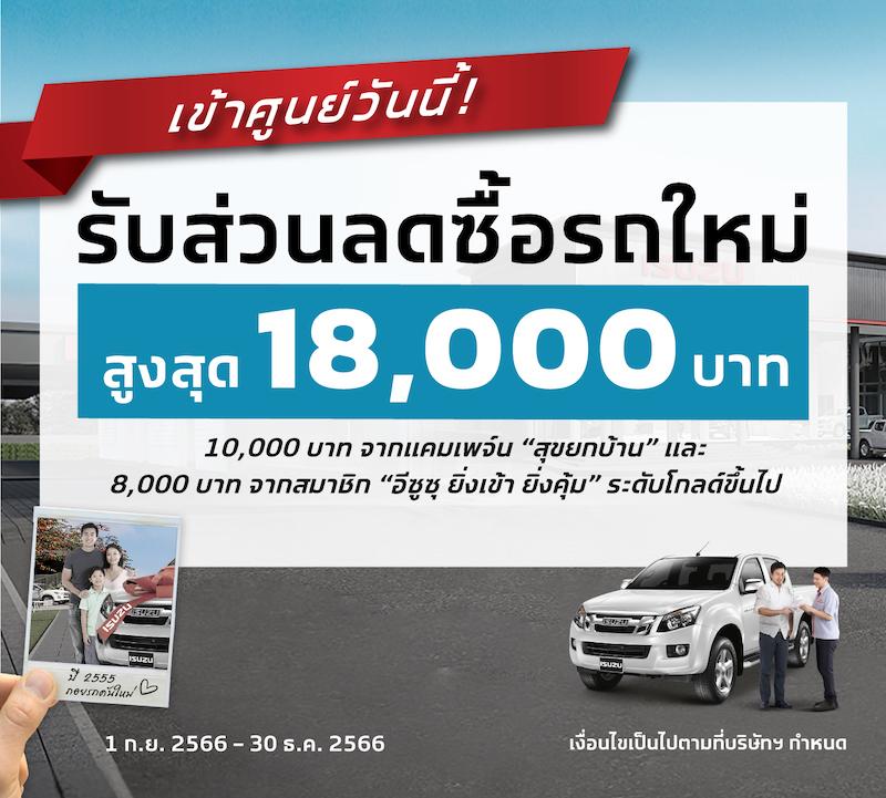 • ส่วนลดซื้อรถใหม่ สำหรับรถปิกอัพและรถยนต์นั่งอเนกประสงค์ใหม่สำหรับลูกค้าเก่าอีซูซุและครอบครัวสูงสุด 18,000 บาท