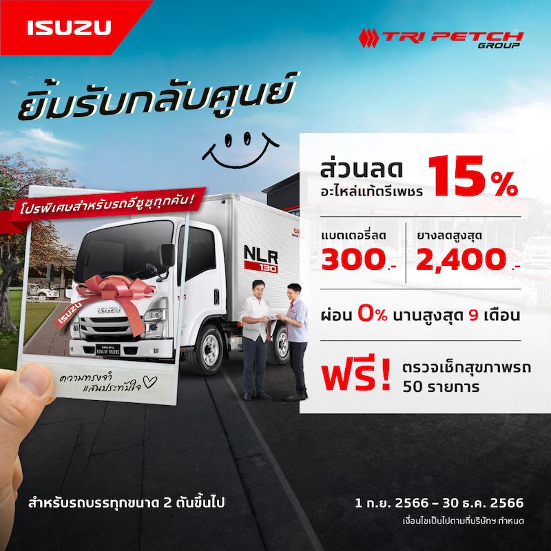 ผู้ใช้รถปิกอัพ รถยนต์นั่งอเนกประสงค์อีซูซุทุกรุ่น และรถบรรทุกอีซูซุขนาด 2 ตันขึ้นไป เข้ารับบริการที่ศูนย์บริการมาตรฐานอีซูซุกับแคมเพจ์นสุดพิเศษ “ยิ้มรับกลับศูนย์” ตั้งแต่วันที่ 1 กันยายน 2566 – 30 ธันวาคม 2566