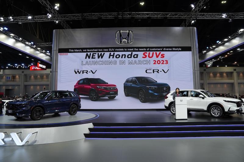 เพื่อตอบสนองความต้องการของลูกค้าในตลาดเอสยูวีที่เติบโตอย่างต่อเนื่อง โดยได้นำมาจัดแสดงเป็นไฮไลต์ในงานมอเตอร์โชว์ 2023 ได้แก่ ฮอนด้า ดับเบิลยูอาร์วี ใหม่  ยนตรกรรมอเนกประสงค์ 5 ที่นั่ง และฮอนด้า ซีอาร์วี ใหม่ เจเนอเรชันที่ 6 ที่สุดแห่งยนตรกรรมพรีเมียมเอสยูวีขนาดใหญ่ มาพร้อมดีไซน์สปอร์ตแข็งแกร่งทุกมิติ กับ 2 ขุมพลังการขับเคลื่อน ครั้งแรกกับระบบฟูลไฮบริด e:HEV อันทรงพลังในซีอาร์-วี และขุมพลังเบนซินเทอร์โบ มาพร้อมเทคโนโลยีความปลอดภัยอัจฉริยะ Honda SENSING ในทุกรุ่นย่อย พร้อมทั้งอีกหนึ่งไฮไลต์ที่แฟน ๆ ฮอนด้ารอคอยกับฮอนด้า ซีวิค ไทป์ อาร์ (Civic Type R) ที่สุดแห่งยนตรกรรมความสปอร์ต สุดเอกซ์คลูซีฟ ที่ได้นำมาจัดแสดงในงานนี้และเปิดรับจองสิทธิ์จำนวนจำกัดอย่างเป็นทางการในวันที่ 22 มีนาคม 2566 เวลา 10:00 น. เป็นต้นไป”