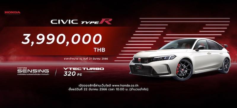ฮอนด้า ซีวิค ไทป์ อาร์ พร้อมจำหน่ายในราคา 3,990,000 บาท เปิดรับจองสิทธิ์จำนวนจำกัดอย่างเป็นทางการผ่านทาง www.honda.co.th ตั้งแต่วันที่ 22 มีนาคม 2566 เวลา 10:00 น. เป็นต้นไป โดยมีให้เลือกทั้งหมด 5 สี ได้แก่สีดำคริสตัล (มุก)  สีเทาโซนิค (มุก)  สีแดงแรลลี่  พร้อมสีใหม่ สีขาวแชมเปียนชิป และสีน้ำเงินเรซซิง (มุก)