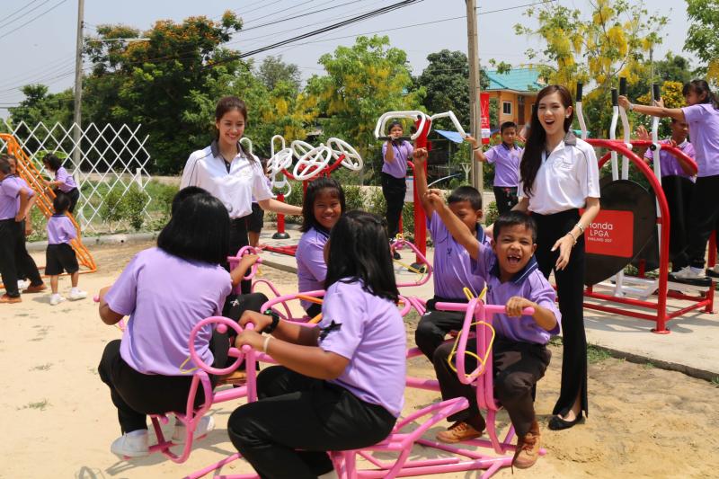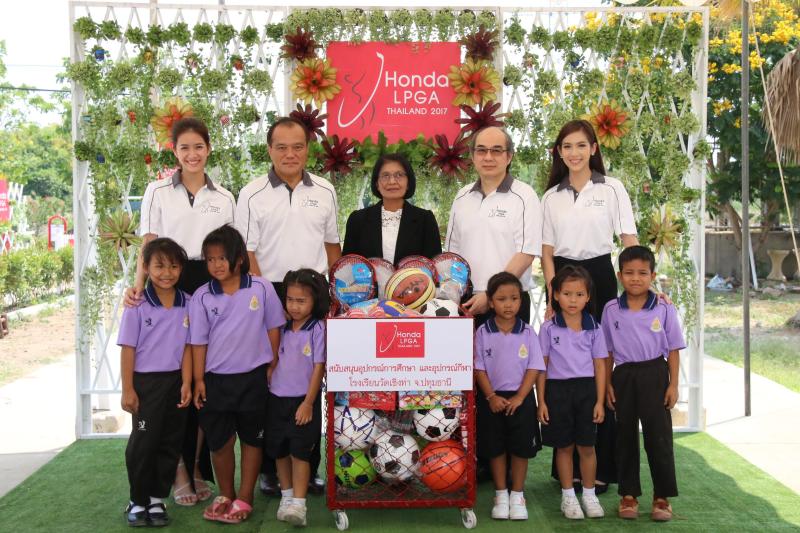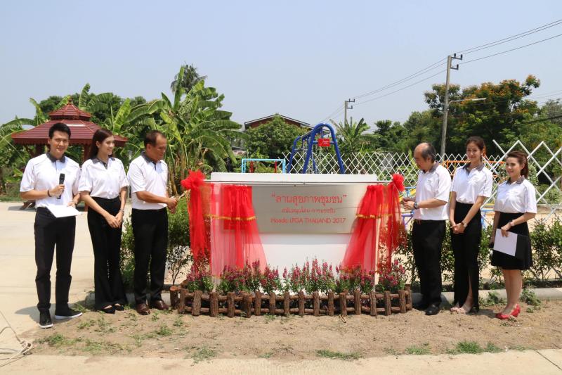 เมื่อเร็ว ๆ นี้ นายพิทักษ์ พฤทธิสาริกร (แถวหลัง ที่ 2 จากซ้าย) ประธานเจ้าหน้าที่บริหารปฏิบัติการ บริษัท ฮอนด้า ออโตโมบิล (ประเทศไทย) จำกัด และนายพลากร สมสุวรรณ (แถวหลัง ที่ 2 จากขวา) กรรมการผู้จัดการ สถานีโทรทัศน์สีกองทัพบกช่อง 7 พร้อมนักแสดงช่อง 7 สี ร่วมพิธีเปิดเพื่อส่งมอบ “ลานสุขภาพชุมชน สนับสนุนโดย การแข่งขัน ฮอนด้า แอลพีจีเอ ไทยแลนด์ 2017” ให้กับชุมชน ต.บางกระบือ อ.สามโคก จ.ปทุมธานี เพื่อส่งเสริมให้คนในชุมชนได้ใช้เป็นพื้นที่สำหรับกิจกรรมสันทนาการ หรือเพื่อการออกกำลังกาย