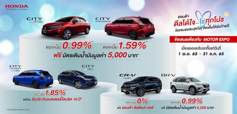 • พร้อมด้วยฮอนด้า ซีวิค ยนตรกรรมสปอร์ตพรีเมียมซีดานไอคอนยอดนิยม โดยทุกรุ่นย่อยขับเคลื่อนด้วยเครื่องยนต์ VTEC TURBO 1.5 ลิตร ใหม่ พร้อมระบบเกียร์ CVT ให้กำลังสูงสุด 178 แรงม้า และมาพร้อมเทคโนโลยีความปลอดภัยอัจฉริยะ Honda SENSING มาพร้อมข้อเสนอพิเศษดอกเบี้ย 2.79%* พร้อมฟรีประกันภัย 1 ปี* เมื่อจองและรับรถตั้งแต่วันที่ 1 พฤศจิกายน 2565 – 31 ธันวาคม 2565