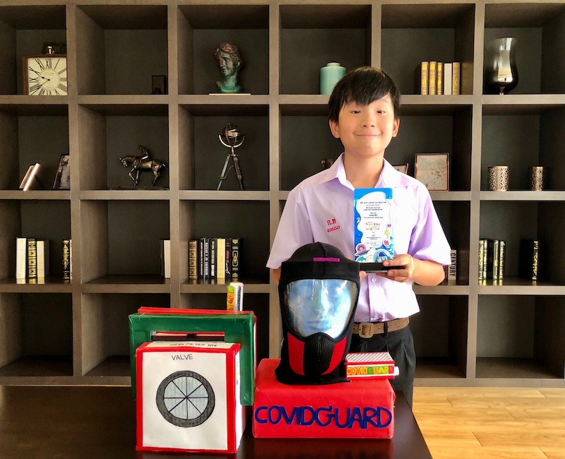 ด.ช.พฤณ จันทาภากุล (พรีโม่) ชั้นประถมศึกษาปีที่ 6 โรงเรียนกรุงเทพคริสเตียนวิทยาลัย กรุงเทพมหานคร กับผลงาน “Covid Guard”