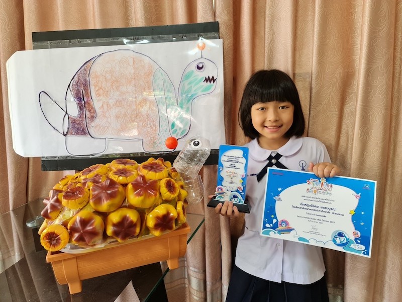 ด.ญ.วิวิศนา ผลสมบูรณ์ (สมายล์) ชั้นประถมศึกษาปีที่ 3 โรงเรียนสาธิตจุฬาลงกรณ์มหาวิทยาลัย ฝ่ายประถม กรุงเทพมหานคร กับผลงาน “หุ่นยนต์เต่ากำจัดวัชพืช สร้างปุ๋ย”