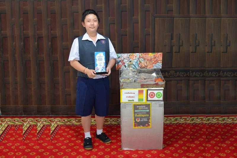 ด.ช. วชิรวิชญ์ เชิดพานิช (โปรตอน) ชั้นประถมศึกษาปีที่ 5 โรงเรียนบ้านโครงงานครูกวีวิทย์ เจ้าของผลงาน “น้ำแข็งดับคาวอาหารทะเล”