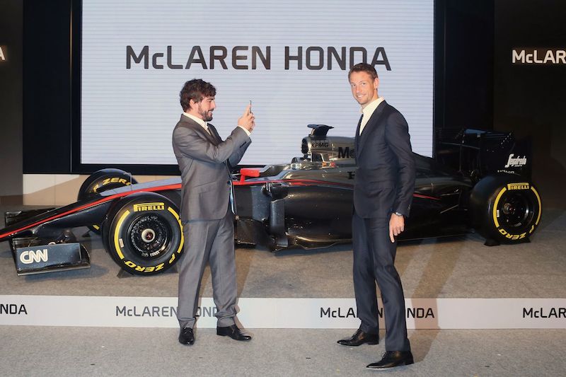 ในภาพ เฟอร์นานโด อลองโซ่ และ เจนสัน บัตตั้น ในงานแถลงข่าวถ่ายภาพร่วมกับ รอน เดนนิส ประธานแมคลาเรน และ นากาโนบุ ประธาน ฮอนด้า มอเตอร์ พร้อมรถแข่งคันใหม่