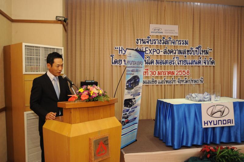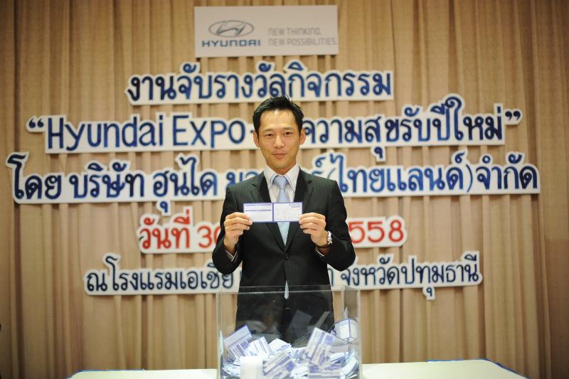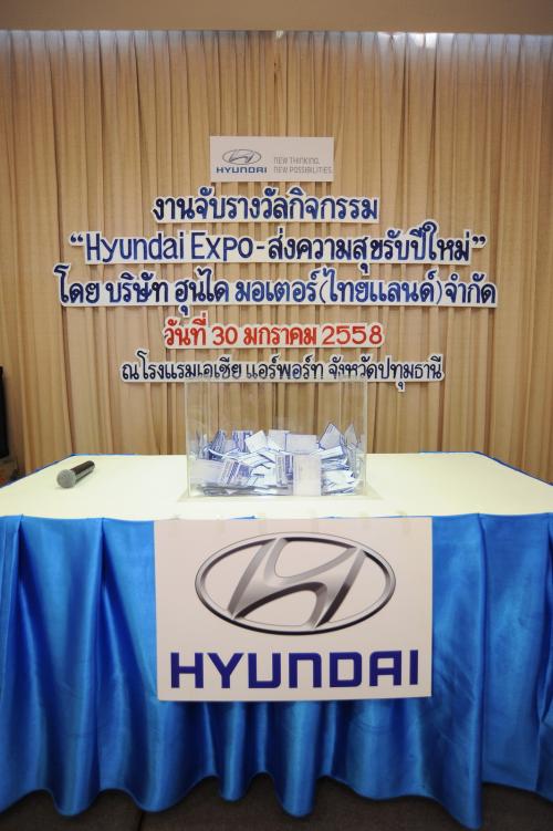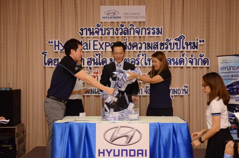 เมื่อวันที่ 30 มกราคม 2558 บริษัท ฮุนได มอเตอร์ (ไทยแลนด์) จำกัด ได้จัดงานมอบรางวัลให้แก่ผู้โชคดีจากแคมเปญ “Hyundai Expo ส่งความสุขรับปีใหม่” โดยมี มร. โยชิกาซึ โคนิชิ ผู้จัดการทั่วไป เป็นประธานในการจับรางวัลมอบโชค พร้อมได้รับเกียรติจากสื่อมวลชนอาวุโสและแขกผู้มีเกียรติร่วมจับรางวัลและเป็นสักขีพยานในกิจกรรม ณ โรงแรมเอเชีย แอร์พอร์ต (เซียร์รังสิต) จ.ปทุมธานี
