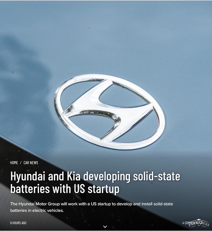 รายงานข่าวจากสหรัฐอเมริกา ระบุว่า ฮุนได และ เกีย อยู่ระหว่างความพยายามในการพัฒนา โซลิด สเตท แบตเตอรี่ ร่วมกับบริษัทสตาร์ทอัพ ใน แมสซาจูเส็ท เพื่อนำมาใช้งานใน ฮุนได กรุ๊พ