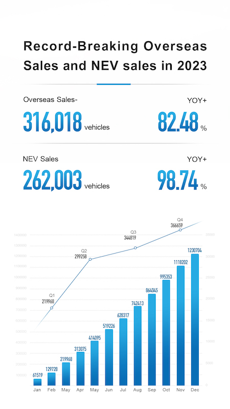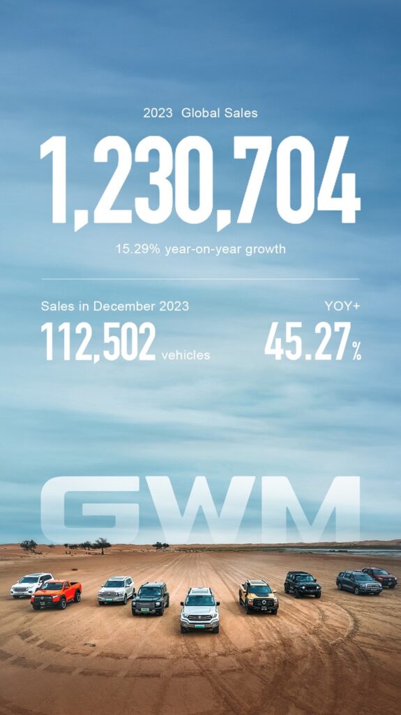 เกรท วอลล์ มอเตอร์ เผยยอดขายประจำปี 2566 บรรลุความสำเร็จครั้งสำคัญในการขยายธุรกิจสู่ตลาดโลก ด้วยการทำยอดขายรถยนต์รวมทั่วโลกทั้งหมด 1.23 ล้านคัน ซึ่งถือเป็นปีที่ 8 ที่ยอดขายทั่วโลกมากกว่า 1 ล้านคันอย่างต่อเนื่อง โดยเป็นยอดขายในตลาดต่างประเทศที่สูงเป็นประวัติการณ์ถึง 300,000 คัน โดยในเดือนธันวาคมที่ผ่านมามียอดขายเพิ่มสูงขึ้นอย่างน่าพึงพอใจ เพียงเดือนเดียวสามารถกวาดยอดขายถึง 33,476 คัน สะท้อนถึงการเติบโตที่แข็งแกร่งและการดำเนินธุรกิจในระดับสากลของบริษัทฯ