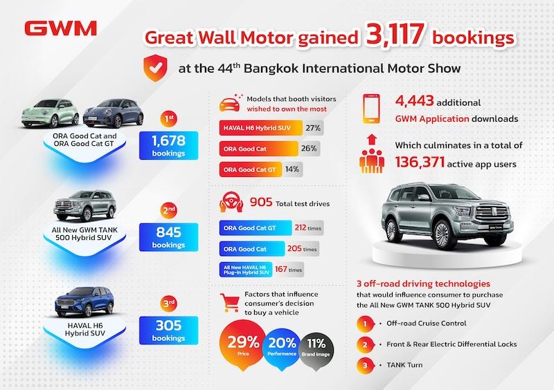 ตลอดการจัดงาน เกรท วอลล์ มอเตอร์ สามารถสร้างยอดจองรถยนต์ได้รวมทั้งสิ้น 3,117 คัน แบ่งเป็นรุ่น ORA Good Cat และ ORA Good Cat GT จำนวน 1,678 คัน, All New GWM TANK 500 Hybrid SUV จำนวน 845 คัน, HAVAL H6 Hybrid SUV จำนวน 305 คัน, และ HAVAL JOLION Hybrid SUV จำนวน 289 คัน