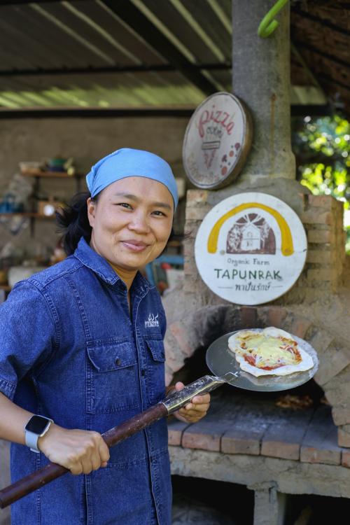 หลังมื้อกลางวันที่ร้านขนมจีนหม้อดิน คณะสื่อได้จัดขบวนรถเดินทางลัดเลาะผ่านเส้นทางทุ่งที่คดเคี้ยว ซึ่งเครื่องยนต์ 1.9 ดีดีไอ บลูเพาเวอร์ ของ ใหม่! อีซูซุดีแมคซ์ “สเทลธ์” ยังคงให้พลังแรงเต็มประสิทธิภาพ เพื่อไปร่วมทำ Workshop พิซซ่าเตาถ่านกลางไร่ ณ ทาปันรักษ์ Workshop & Farm Stay ของคุณกรรณิการ์ ตันเส้า หรือ ก้อย นักวิชาการที่มาใช้ชีวิตพอเพียงด้วยการสร้างบ้านดินเพื่อเปิดเป็นที่พักแนวฟาร์มสเตย์ ปลูกและจำหน่ายผลผลิต ตลอดจนทำอาหารที่ใช้วัตถุดิบจากเกษตรอินทรีย์ โดยคณะสื่อมวลชนได้ร่วมสนุกทำพิซซ่าเตาถ่านท่ามกลางบรรยากาศที่สวยงามและเป็นธรรมชาติ