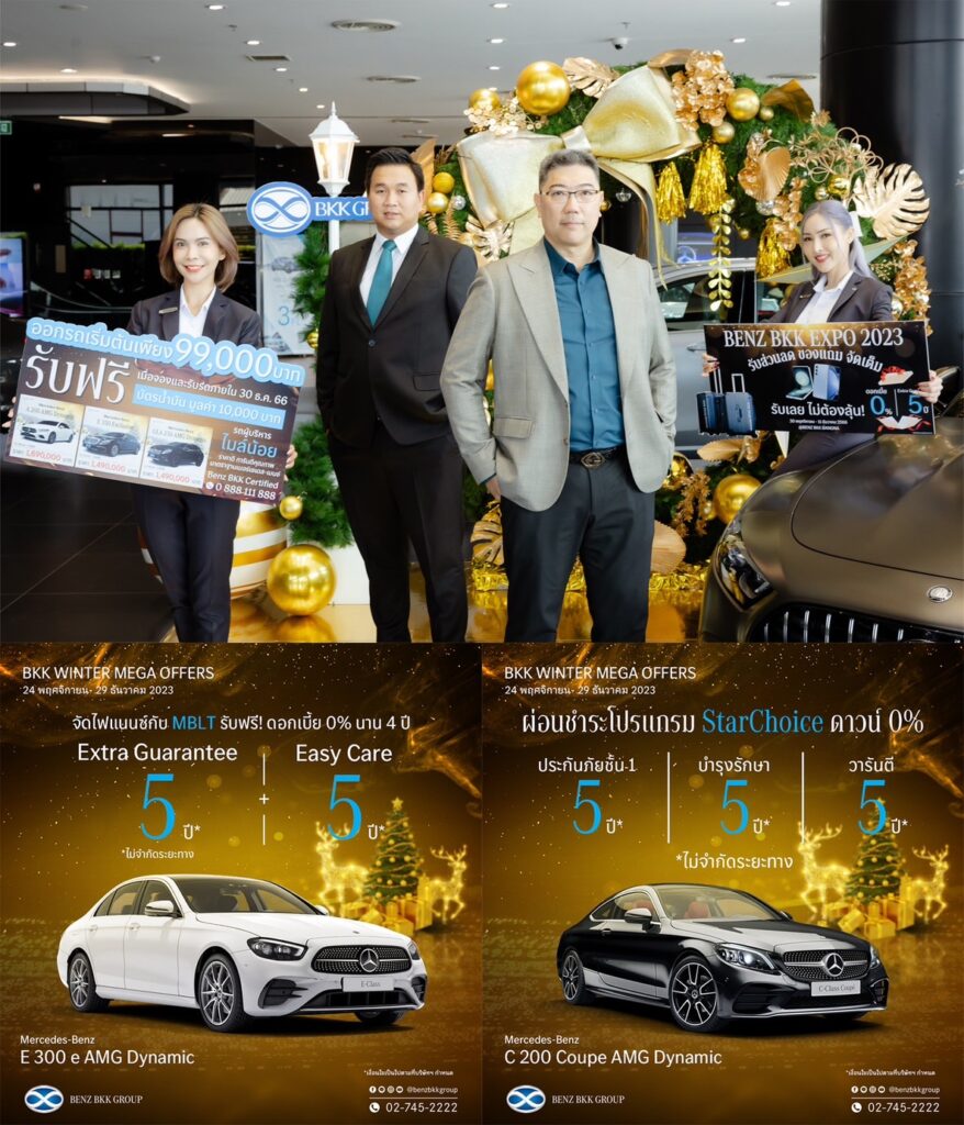 นายเอกพงษ์ จินดาสมัย ผู้ช่วยกรรมการผู้จัดการฝ่ายขาย และการตลาด และ นายปริวัตร คงคลัง ผู้จัดการทั่วไปฝ่ายขาย Certified เผยดีลสุดพิเศษว่า “สำหรับแคมเปญส่งท้ายปี เบนซ์ บีเคเค บางนา มากับข้อเสนอแบบพร้อมจบทุกดีล สามารถปรับได้ตามความเหมาะสมและความต้องการของลูกค้า พร้อมให้ส่วนลดสูงสุดถึง 1.5 ล้านบาท สำหรับรถรุ่นที่ร่วมรายการ อีกทั้งยังเปิดโชว์รูมให้ลูกค้าได้เข้ามาสัมผัสและทดลองขับรถยนต์ เมอร์เซเดส-เบนซ์ ทุกรุ่น ในงาน BENZ BKK MOTOR EXPO 2023 ตั้งแต่วันที่ 30 พฤศจิกายน -11 ธันวาคม 2566 อำนวยความสะดวกให้กับลูกค้าโดยไม่ต้องเดินทางฝ่ารถติดไปถึงเมืองทองธานี ก็สามารถรับดีลดี ดีลเดียวกันกับงาน Motor Expo แถมให้มากกว่าด้วยสมาร์ทโฟนสุดฮิต Samsung Galaxy Z Flip 5 มูลค่า 39,900 บาท หรือ Samsung Galaxy Z Fold 5 มูลค่า 59,900 บาท ฟรี! แบบไม่ต้องลุ้น เพียงออกรถรุ่นที่ร่วมรายการ ไม่ว่าจะเป็น GLA 200 AMG Dynamic, A 200 AMG Dynamic, Mercedes-Benz C 200 Coupe AMG Dynamic, CLS 53 4MATIC+, CLS 220 d AMG Premium, E-Class, GLC 300 e 4MATIC AMG Dynamic, S 580 e AMG Premium พร้อมรับกระเป๋าเดินทาง BKK Travel Trunk 1 ใบ มูลค่า 7,990 บาท อีกด้วย เบนซ์ บีเคเค บางนา นำเสนอโปรแกรม StarChoice (สตาร์ช้อยส์) โปรแกรมทางการเงินรูปแบบใหม่ที่มอบอิสรภาพให้กับคุณ พร้อมคลายความกังวลครอบคลุมทุกค่าใช้จ่าย ไม่ว่าจะเป็นค่าบำรุงรักษา ค่าประกันภัยชั้น1 ค่าต่อภาษีรถยนต์ประจำปี นานสูงสุดถึง 5 ปี โดยเริ่มต้นดาวน์เพียง 0% พร้อมแถมฟรี!! บัตรของขวัญมูลค่าสูงสุด 50,000 บาท และ Mercedes-Benz Bag นอกจากนั้นที่ BKK Café มีบริการเสิร์ฟอาหารหลากหลายเมนูอร่อย เมเจอร์ ป๊อปคอร์น และเครื่องดื่มฟรีตลอดงาน พร้อมกิจกรรมและของแถมแบบจัดเต็ม นายปริวัตร คงคลัง ผู้จัดการทั่วไปฝ่ายขาย Certified เสริมว่า เบนซ์ บีเคเค เซอร์ทิฟายด์ ตั้งอยู่บนพื้นที่โชว์รูมชั้น 3 มีรถเบนซ์ ยูสคาร์จอดโชว์ให้เลือกชมมากกว่า 70 คัน ทุกคันผ่านการตรวจเช็คกว่า 200 รายการ มาตรฐานเมอร์เซเดส-เบนซ์ ทำให้ลูกค้ามั่นใจได้ว่าจะได้รถที่ปลอดภัย คุณภาพดี ในราคาที่คุ้มค่า ดีลพิเศษส่งท้ายปี ให้คุณเป็นเจ้าของรถยนต์เมอร์เซเดส-เบนซ์ได้ง่ายขึ้น ด้วยเงินออกรถเริ่มต้นเพียง 99,000 บาท และรับฟรี! บัตรเติมน้ำมันมูลค่า 10,000 บาท  เมื่อจองและรับรถภายในวันที่ 29 ธันวาคม 2566 สำหรับผู้ที่สนใจเปลี่ยนรถ กำลังมองหารถคันใหม่ “รถคันเก่ามีค่า เก่าแลกใหม่ได้แบบไม่ต้องดาวน์ แถมมีเงินเหลืออีกด้วย*”