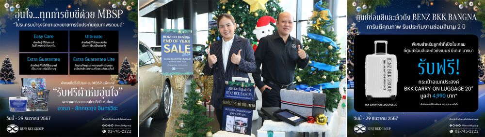 นางสาวลภัสวรรณ ผูกทอง ผู้จัดการทั่วไปฝ่ายบริการหลังการขาย ฝ่ายศูนย์บริการ พร้อมด้วย นายสมชาย เซี้ยเจริญ ผู้จัดการศูนย์ซ่อมสีและตัวถัง ร่วมนำเสนอแคมเปญศูนย์บริการด้วยว่า “ถึงช่วงเวลาแห่งความสุข ศูนย์บริการร่วมส่งมอบความสุข เพียงนำรถเข้ารับบริการที่ศูนย์บริการตลอดเดือน ธันวาคมนี้ รับ BKK Dairy 2025 พร้อม BKK Pouch ทันทีและที่ศูนย์บริการซ่อมสีและตัวถัง เมื่อเปิดใบเคลม 100,000 บาทขึ้นไป รับฟรี! BKK CARRY-ON LUGGAGE 20” มูลค่า 4,990 บาท พิเศษเฉพาะที่เบนซ์ บีเคเค บางนา เท่านั้น! อีกทั้งยังทิ้งท้ายแคมเปญ “ตรวจรถฟรี ขับขี่ปลอดภัย ไปกับเบนซ์ บีเคเค บางนา” เชิญชวนลูกค้าทุกท่านนำรถเข้าตรวจเช็กฟรี! 67 รายการ ก่อนเดินทางไกลในช่วงฮอลิเดย์ได้ตั้งแต่วันนี้ – 28 ธันวาคม นี้ สนใจนัดหมายล่วงหน้าได้ที่ http://mb4.me/OAB_BenzBKKGroup หรือโทร 02-745-2222”