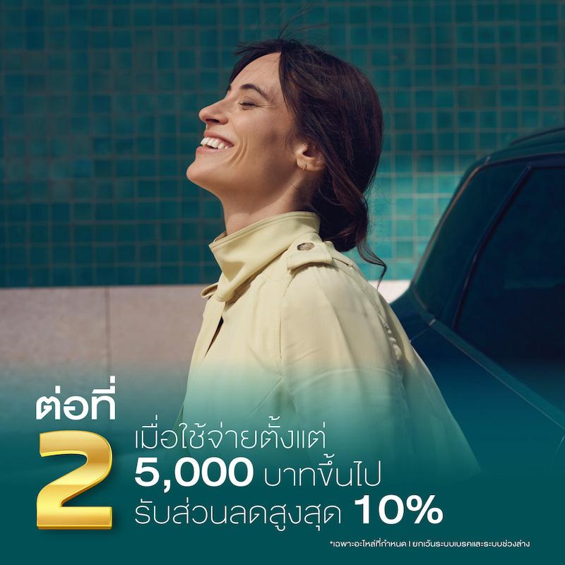 - ต่อที่ 2 ส่วนลดสูงสุด 10% เมื่อใช้จ่ายตั้งแต่ 5,000 บาทขึ้นไป (เฉพาะอะไหล่ที่กำหนด, ยกเว้นระบบเบรกและระบบช่วงล่าง)*